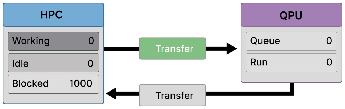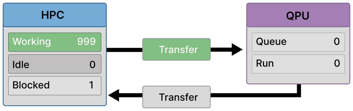 A smaller group is still active on the HPC side (Working = 200), while outbound transfer remains active and the QPU is still idle.